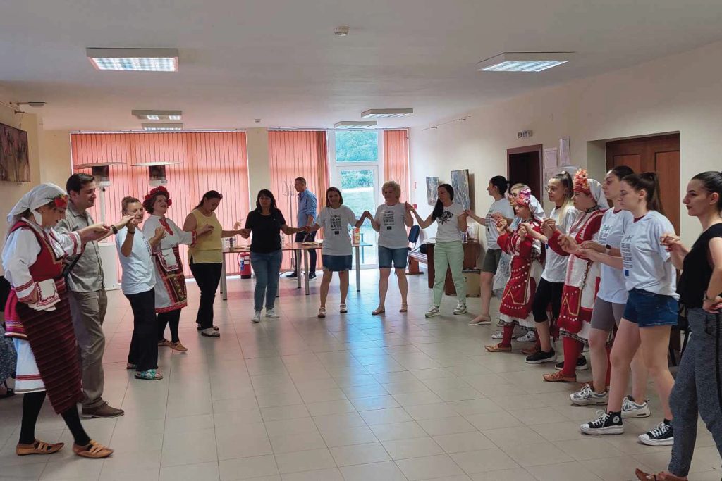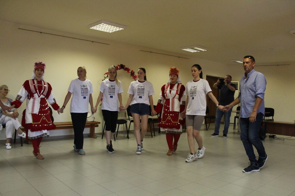 On 24.06.2023 (Saturday) and 25.06.2023 (Sunday), within the framework of the project “The living cultural heritage of two nations on one scene”, a two-day Joint Event “Youths teaching Youths” was organized and held in Mikrevo, Municipality of Strumyani, Bulgaria. At the event, 5 youths from Strumica region (local folk performers) along with a professional choreographer, presented Macedonian culture through the history of the Strumica carnival (customs, long tradition and legends for the Carnival in Strumica). Twenty (20) youth people from Bulgaria participated at the event, at the same time building friendship and raising their knowledge about the living cultural values of Macedonia. Total of 26 participants attended the event in Mikrevo.